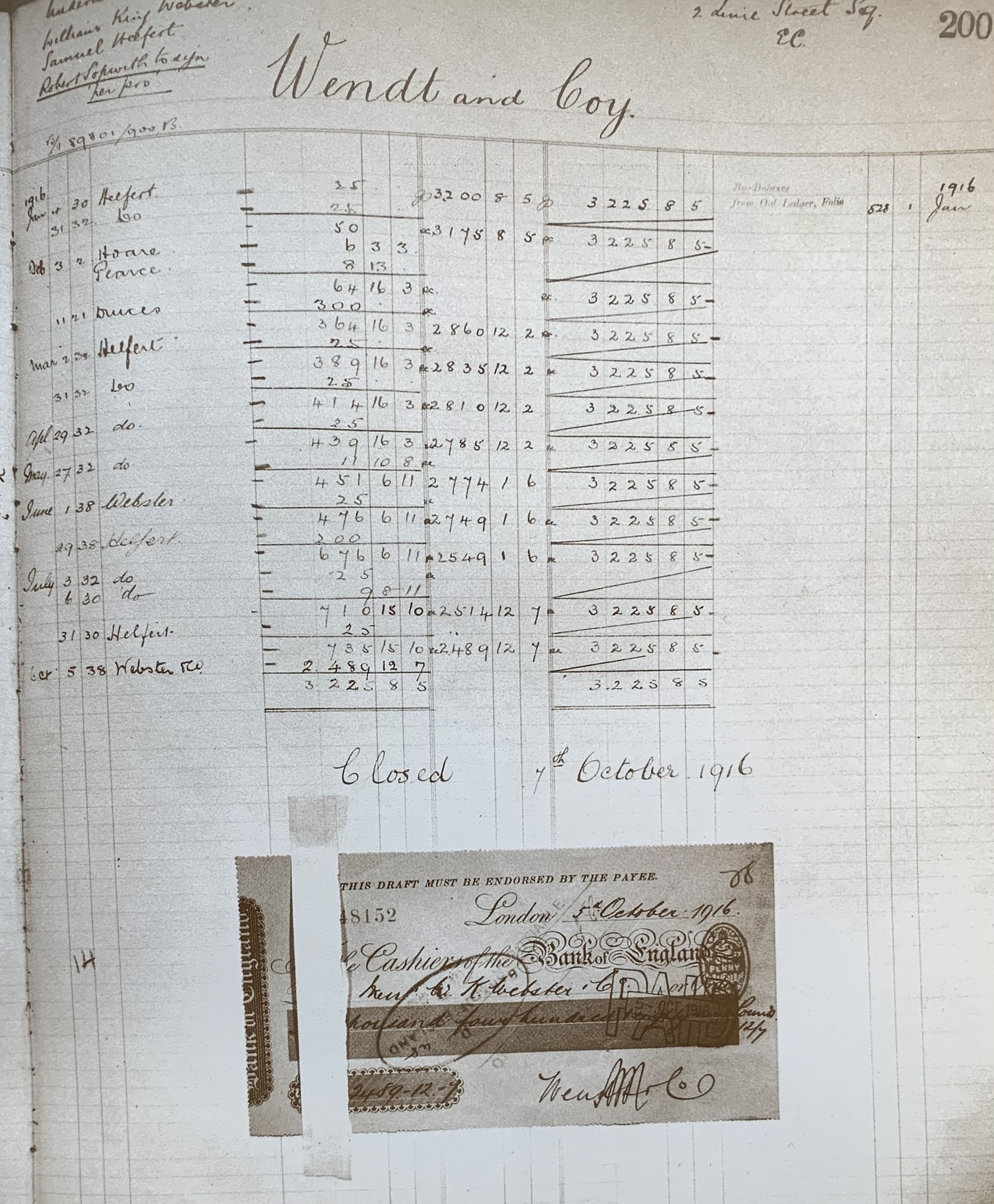 As we all know war broke out in 1914, and Helfert, by reason of his nationality, was interned on the Isle of Man. By early 1915, W K Webster was receiving many letters from principals advising that they considered it inappropriate to continue trading with a firm with a German name and/or Partner. Understandably, feelings were running rather high at the time and as a result W K Webster applied to the Court for Wendt & Co to be dissolved. The connection between the names, however, is that William King Webster became personally entitled under the judgment to the entire goodwill and assets of Wendt & Co, save the name. We still have the actual cheque dated 5 October 1916, drawn on the Bank of England, settling the balance of the account of Wendt & Co on W K Webster & Co (shown below).